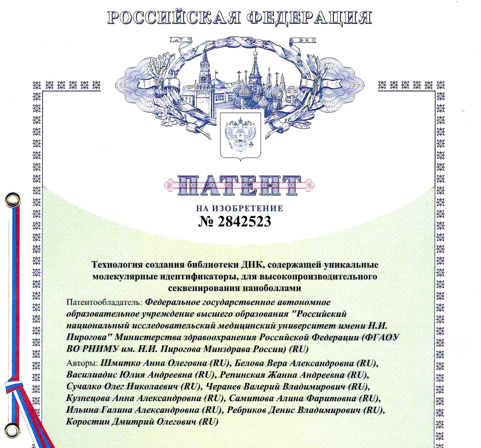 Рады сообщить, что мы получили патент на технологию создания библиотек ДНК с уникальными молекулярными идентификаторами для высокопроизводительного секвенирования на платформах наноболлового типа.